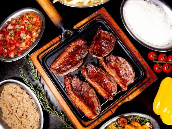 Acompanha: Arroz, vinagrete, batata frita, farofa, feijão tropeiro c/ banana frita.